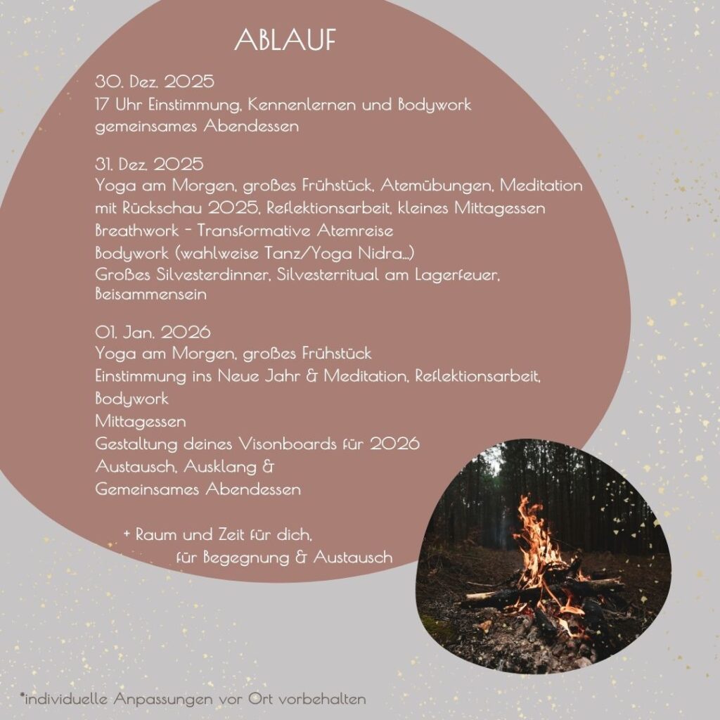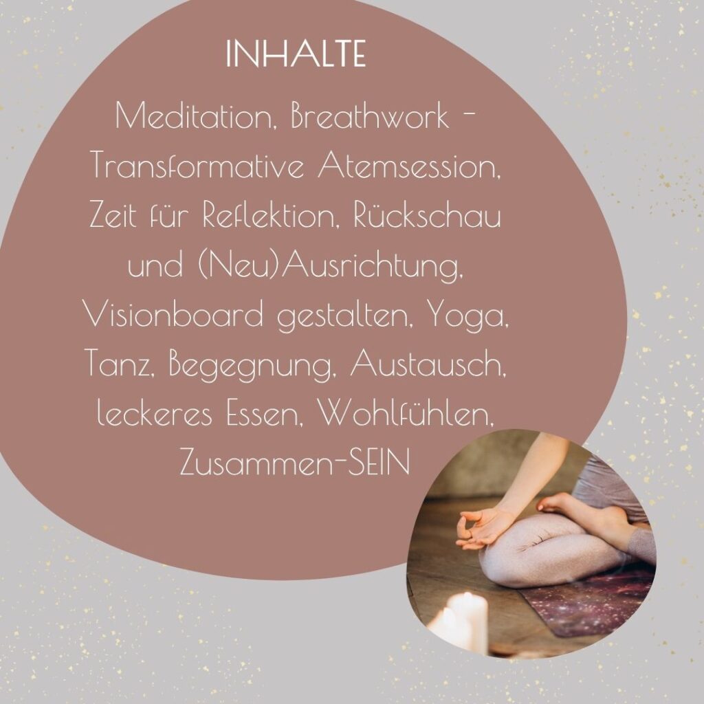 Yoga am Morgen, großes Frühstück, Atemübungen, Meditation mit Rückschau 2025, Reflektionsarbeit, kleines Mittagessen